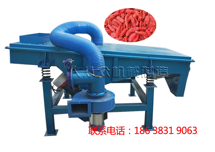 枸杞分級、除雜機由直線振動篩配合適當(dāng)網(wǎng)孔的篩網(wǎng)和風(fēng)機設(shè)備組成,篩網(wǎng)主要是用于透篩大小適合的物料,而風(fēng)機主要的作用是吹去枸杞中所含的雜質(zhì)。