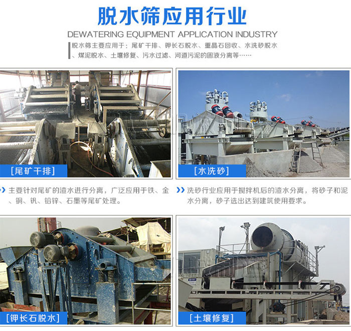 脫水篩是煤泥脫水作業(yè)的專(zhuān)用振動(dòng)篩,它廣泛適用于選煤、電力、選礦、制鹽、化工、制糖等行業(yè)中的細(xì)粒度干式、濕式篩分煤泥回收,過(guò)濾隔粗、壓濾隔粗、其他極細(xì)物料的脫水、過(guò)濾隔粗脫水、脫介、脫泥回收等工藝中。