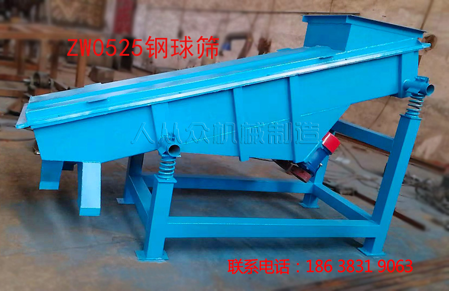 ZW鋼球挑選機主要由箱體、篦子、激振源、臺座、減振彈簧、支架組成。ZW鋼球挑選機是雙激震源驅(qū)動。當兩臺激震源做同步、反向運轉(zhuǎn)時,其偏心塊所產(chǎn)生的激振力在平行于激震源軸線的方向相互抵消,在垂直于激震源軸的方向疊為一合力,因此鋼球(鋼段)在鋼球挑選機上的運動軌跡為直線向前做拋物線運動。兩激震源軸相對箱體有一傾角在激振力和鋼球(鋼段)自重力的合力作用下鋼球(鋼段)在篦子上被拋起跳躍式向運動,從而達到對鋼球(鋼段)進行挑選和分級的目的。