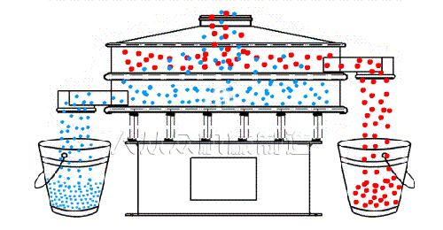 旋振篩采用立式電機(jī)作激振源,工作時(shí)通過偏心重錘將電機(jī)的旋轉(zhuǎn)運(yùn)動轉(zhuǎn)變?yōu)樗?、垂直、傾斜的三次元運(yùn)動,這個(gè)運(yùn)動力傳到篩面,從而使篩面上的物料一起運(yùn)動,伴隨著篩網(wǎng)的運(yùn)動,小于篩面孔徑的物料通過篩孔落到下層,大于篩面孔徑的物料從排料口排出,完成篩分工作。可以通過調(diào)整偏心塊的位置,來改變物料的運(yùn)動軌跡,從而適應(yīng)不同的篩分目的。
