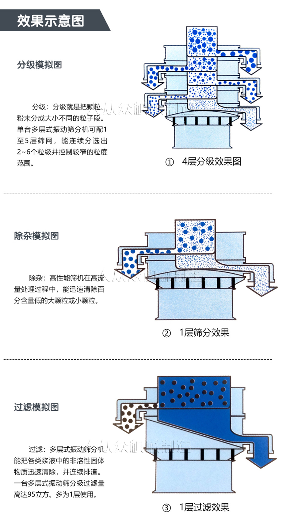 該設(shè)備可根據(jù)客戶不同需求1-5層同時(shí)使用,篩機(jī)1-5層、304不銹及碳鋼材質(zhì)等各種型號齊全,可滿足各種粉末、顆粒篩分需要求及液體過濾需求,也可設(shè)計(jì)為閘門式旋振篩、加緣式旋振篩等機(jī)型。