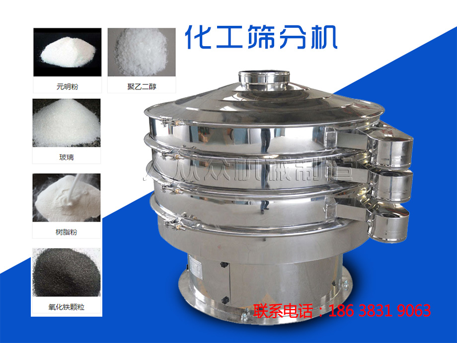 化工振動篩是篩面直徑為400-2000mm的篩分設(shè)備,常被稱為篩分機、篩粉機、振蕩篩等,它采用上、下兩端安裝有偏心重錘的立式振動電機作為激振源,將電機旋轉(zhuǎn)而來的水平、垂直、傾斜的三次元運動傳給篩面,作用于物料。