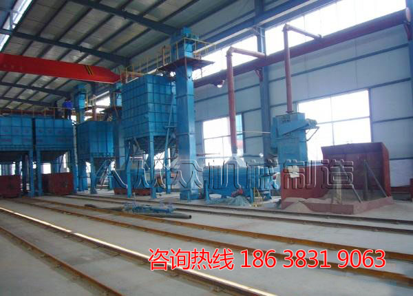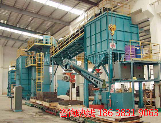 3. 落紗,小車運(yùn)動(dòng)至振動(dòng)落砂機(jī)處,自卸至落砂機(jī),篩上物可回爐二次利用,篩下物經(jīng)研磨落砂至下直線篩,卸車后小車經(jīng)軌道循環(huán)至模具裝車處;