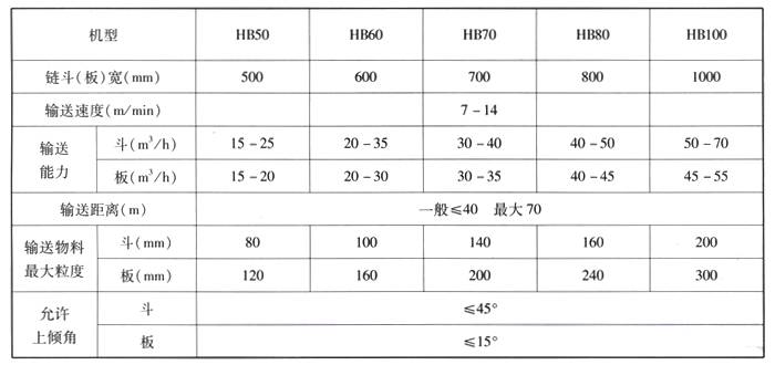 HB型鏈板、鏈斗式輸送機主要技術參數(shù)