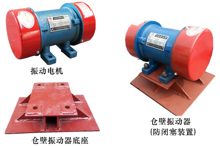 由振動(dòng)電機(jī)、底座兩部分組成。振動(dòng)電機(jī)和底座由螺栓緊密地固定為一體,由于底座堅(jiān)固地安裝在料倉壁上,這樣就構(gòu)成了單質(zhì)點(diǎn)定向振動(dòng)系統(tǒng)。當(dāng)防閉塞裝置工作時(shí),振動(dòng)電機(jī)的高速轉(zhuǎn)動(dòng),便產(chǎn)生了對(duì)料倉壁的周期性高頻振動(dòng),由于防閉塞裝置的周期性振動(dòng),一方面使物料與倉壁脫離接觸、消除物料與倉壁的摩擦,另一方面使物料受交變速度和加速度的影響,處于不穩(wěn)定狀態(tài),從而有效地克服物料的內(nèi)摩擦力和聚集力,以消除料倉內(nèi)物料間的相對(duì)穩(wěn)定性,使物料從料倉口順利排出。