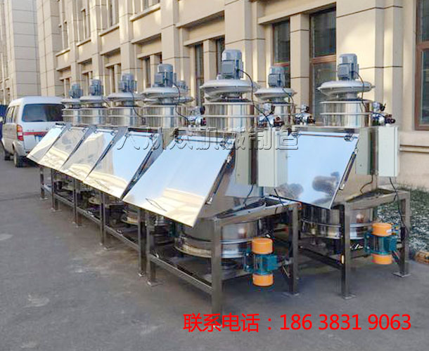 當(dāng)小袋物料需解袋并倒入下一道工序時(shí),只需人工直接拆包后投入到該系統(tǒng),投料時(shí)所產(chǎn)生的物料粉塵由集塵風(fēng)機(jī)進(jìn)行收集。物料通過振動(dòng)篩(安全篩網(wǎng))可將大塊物料和異物攔截,從而保證符合要求的成品(合格物料)進(jìn)入下道工藝。該設(shè)備適用于食品、制藥、化工、冶金行業(yè)中小袋物料的拆包、投放、篩分和卸料,特別適用于粉料人工投料和預(yù)篩分,拆包時(shí)由于集塵風(fēng)機(jī)的作用,可以避免物料粉塵到處飛揚(yáng)。